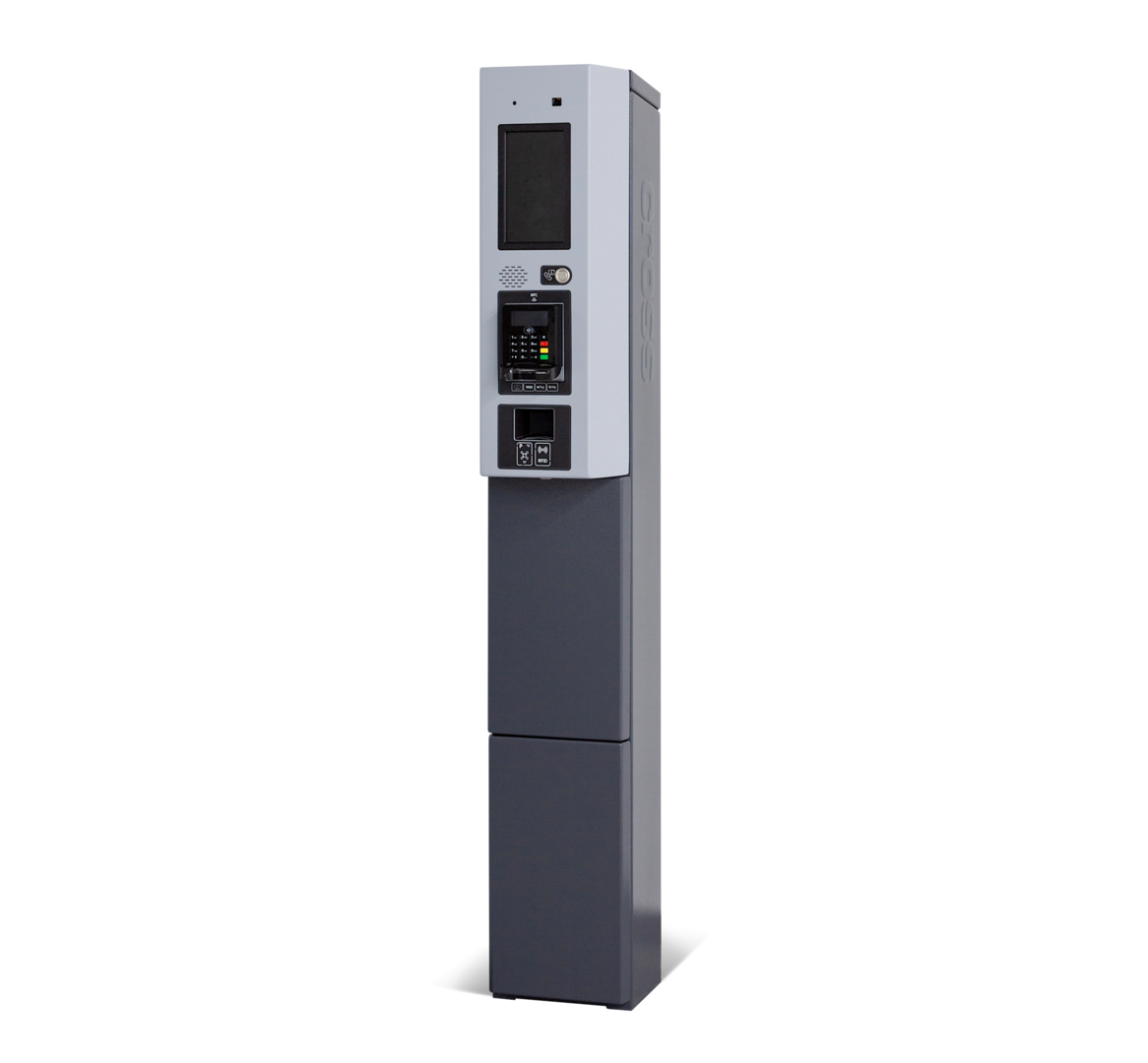 CROSS APTis is a compact self-service parking payment terminal for fast, cashless parking fee payment. It allows ticket scanning using a QR or barcode, RFID card identification, and immediate payment by credit card. Electronic documents and cashless operation reduce service and consumable costs. Thanks to its intuitive touchscreen display and audio-video intercom option, it is easy to use and provides remote user support.
